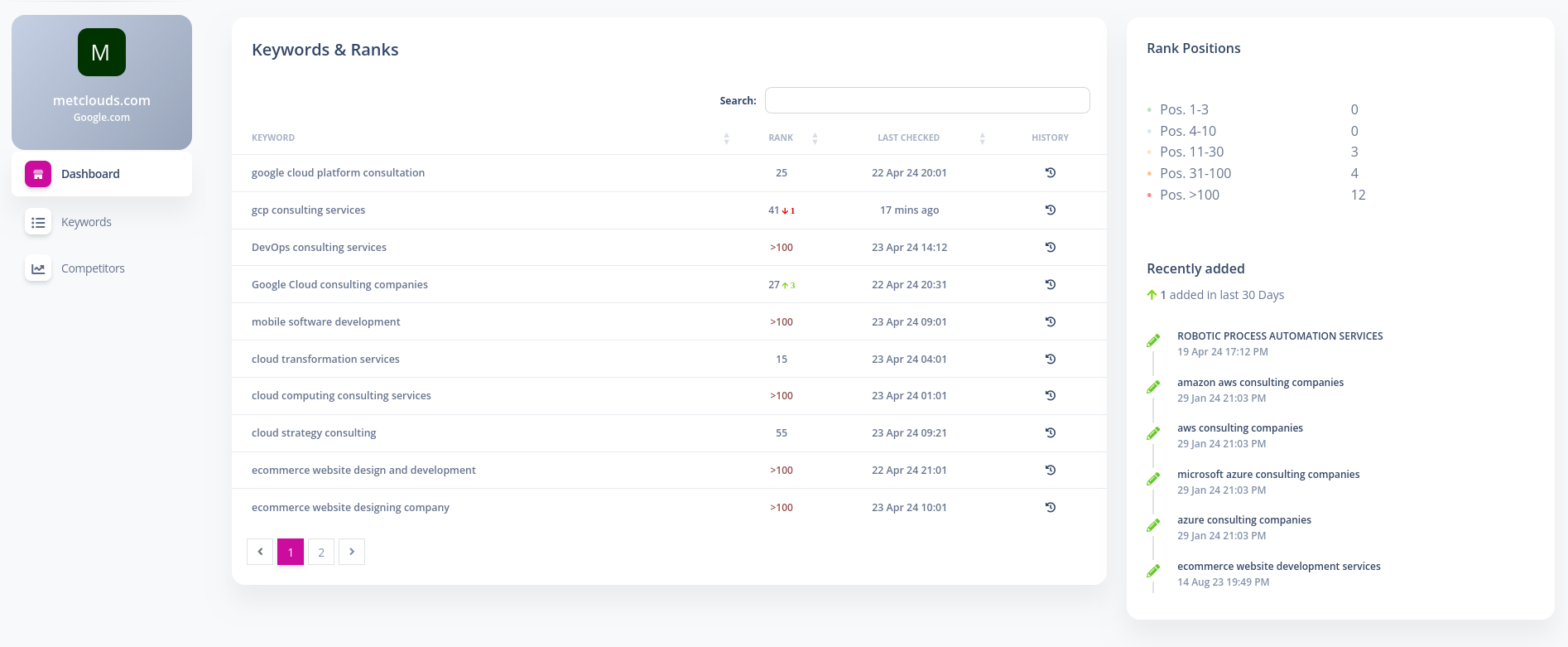 - Comprehensive Dashboard: View essential ranking details such as the current rank position, previous position, last checked time, and rank history.
