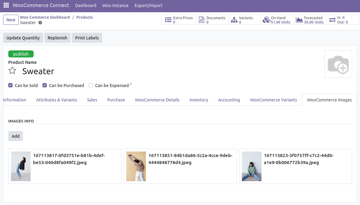 Upload and manage WooCommerce product images directly through Odoo.
