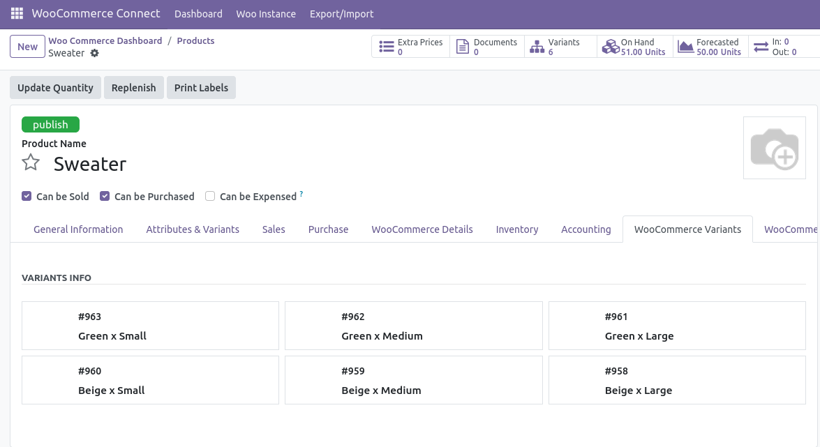 Check and manage WooCommerce product variants, such as size, color, or style, directly from Odoo.
